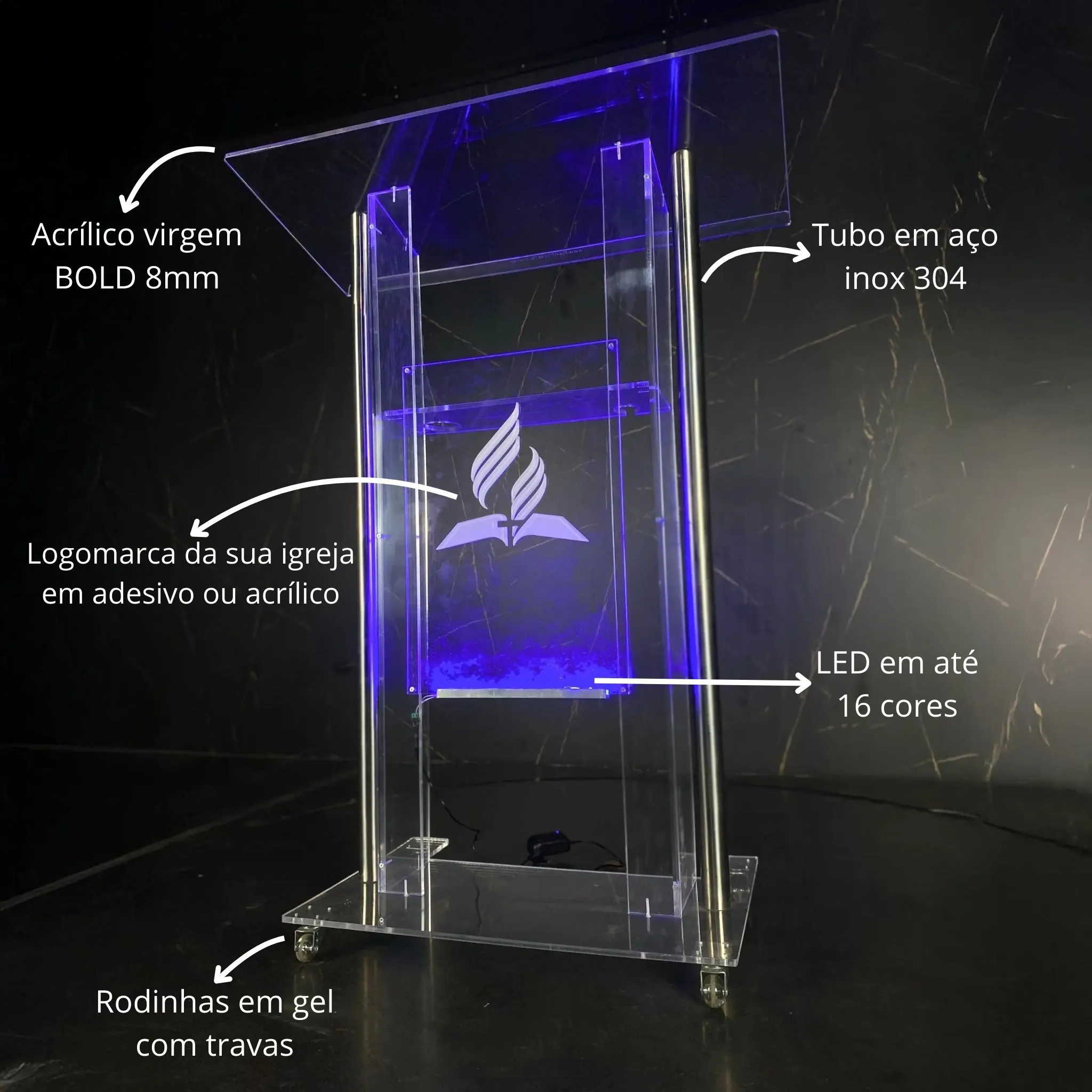 Garanta agora o púlpito de acrílico para igreja Calebe Plus e transforme o altar do seu ministério com elegância, iluminação e funcionalidade. Produção exclusiva e envio rápido para todo o Brasil.