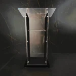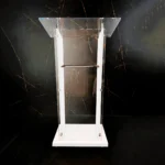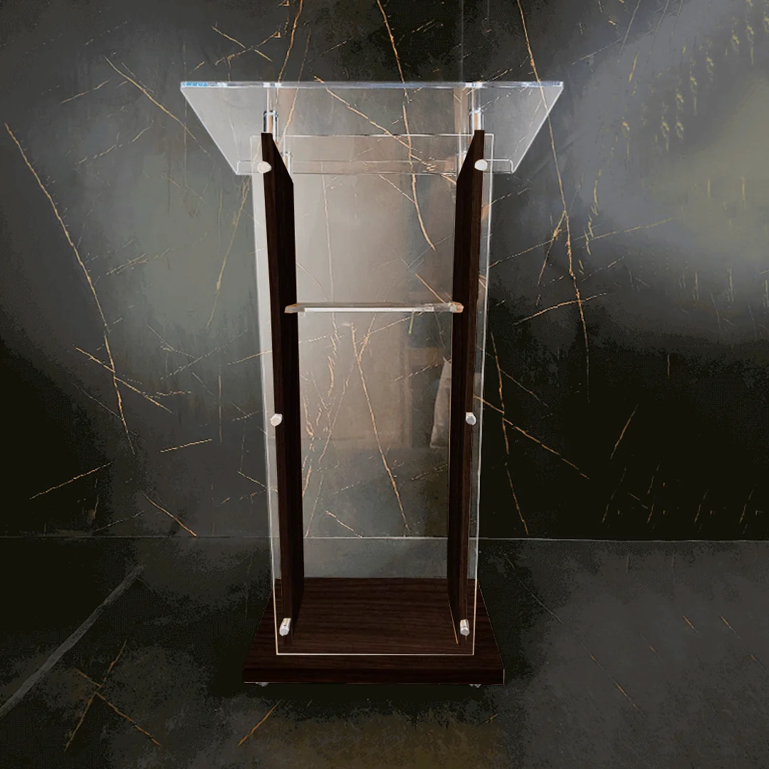 Madeira: Em grande parte das vezes, o espanador de pó é suficiente para remover a poeira da superfície. Para uma limpeza mais completa, utilize uma flanela de microfibra levemente umedecida com uma solução de água e sabão neutro. Após a limpeza, seque bem com outra flanela seca para evitar manchas ou acúmulo de umidade. Para realçar o brilho e conservar a madeira, recomenda-se o uso ocasional de lustra-móveis apropriado para madeira, sempre aplicado com uma flanela macia e em movimentos circulares. Evite produtos abrasivos ou à base de álcool, pois podem danificar o acabamento do púlpito.